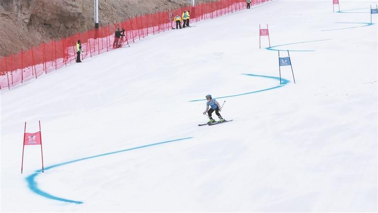 二月九日,在神木市碧麟湾滑雪场,参加省一冬会高山滑雪大回转比赛的运动员在雪道上飞驰。